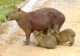 Las capibaras se meten en el agua para refugiarse del calor,escapar de los depredadores y aparearse,y se alimentan de la hierba que crece en la orilla.Muy sociales,suelen vivir en grupos familiares formados por un macho y varias hembras con sus crías,pero en las épocas de sequía pueden agruparse en manadas de un centenar de individuos.